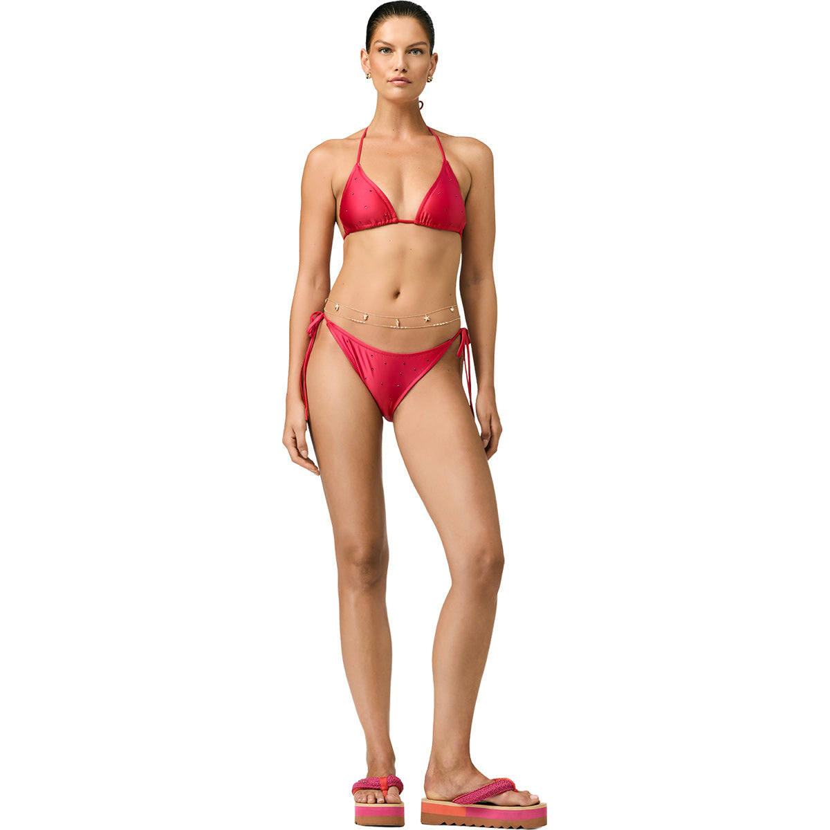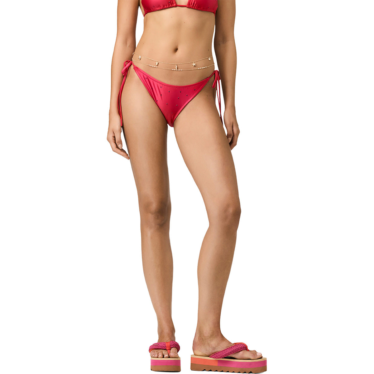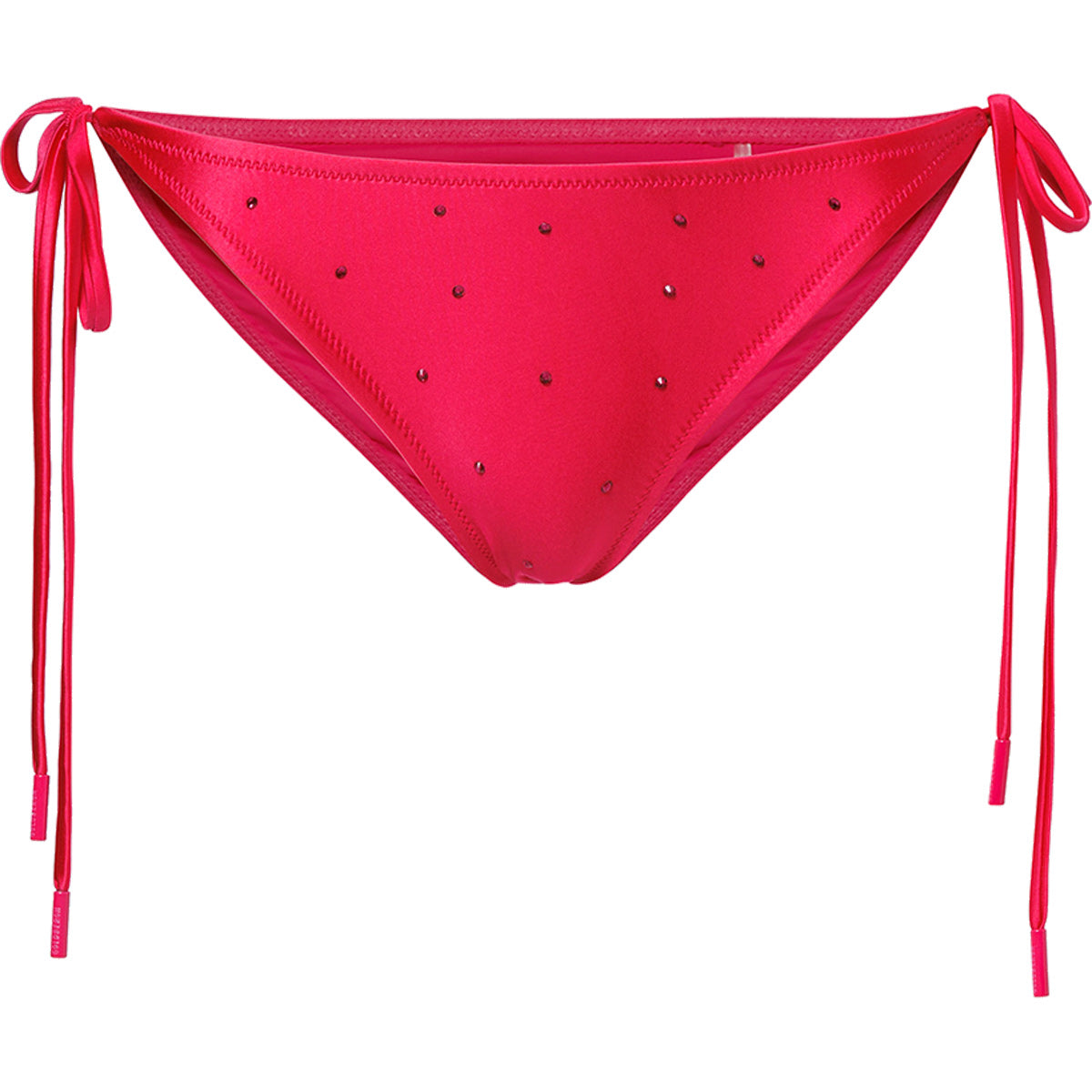 Braguita de bikini triángulo con pedrería decorativa y lazos laterales.