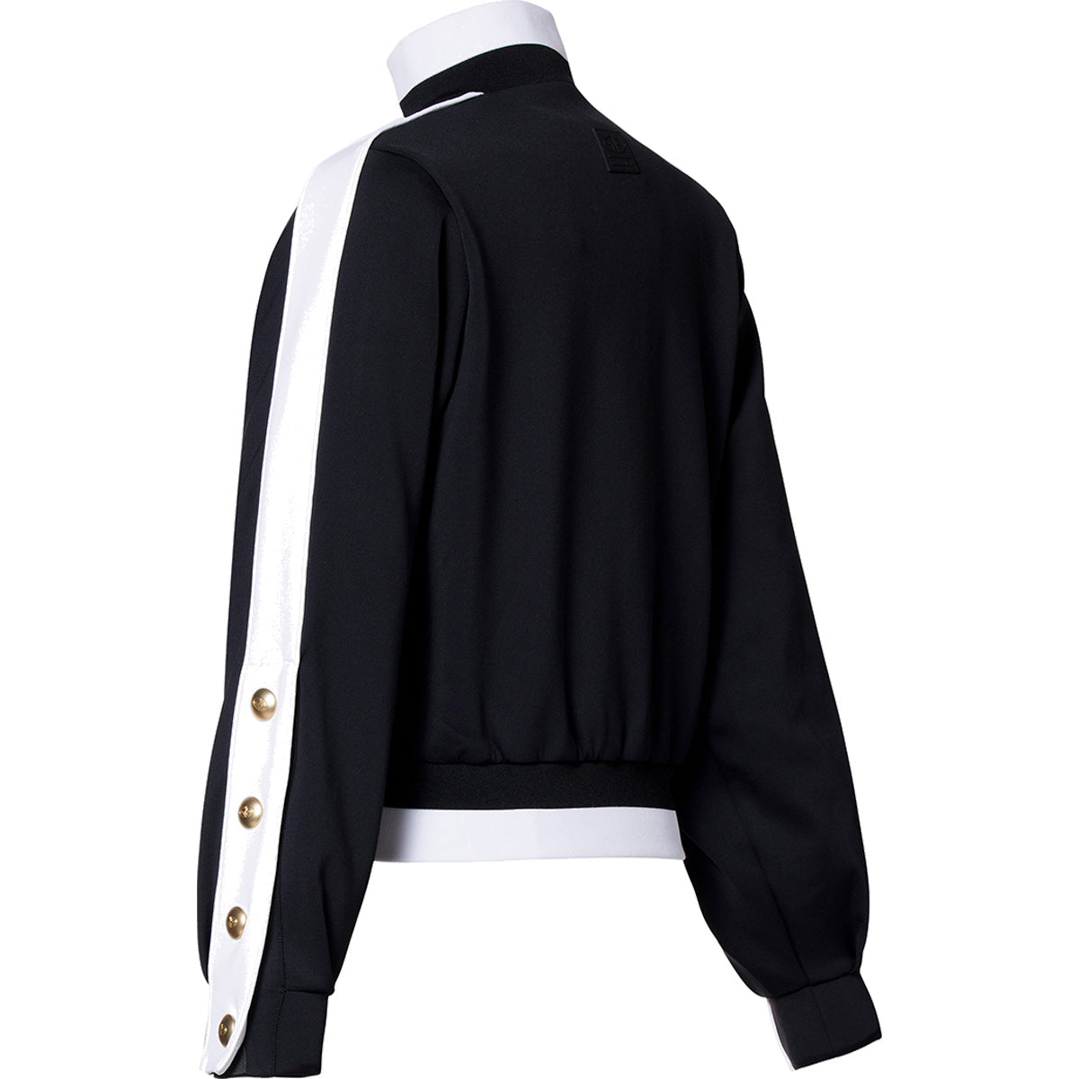 Chaqueta deportiva con cremallera, detalles a rayas y botones decorativos.