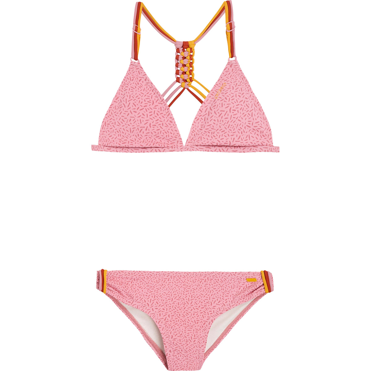 Aquí tienes el precioso PRTFIMKE JR de Protest. Este bikini triangular es especial para adolescentes, está disponible en las tallas 140-176 y viene con copas de espuma extraíbles. Este bikini tiene un estampado de rayas por todas partes y tiene tirantes decorativos de colores brillantes en la parte inferior del bikini. Los tirantes de los hombros están anudados en un bonito dibujo en la espalda. Los tirantes en los hombros y en la espalda son ajustables para que consigas el ajuste perfecto. La braguita del bikini es de corte normal. Este bikini no contiene PFC. Para divertirte bajo el sol, el PRTFIMKE JR de Protest.