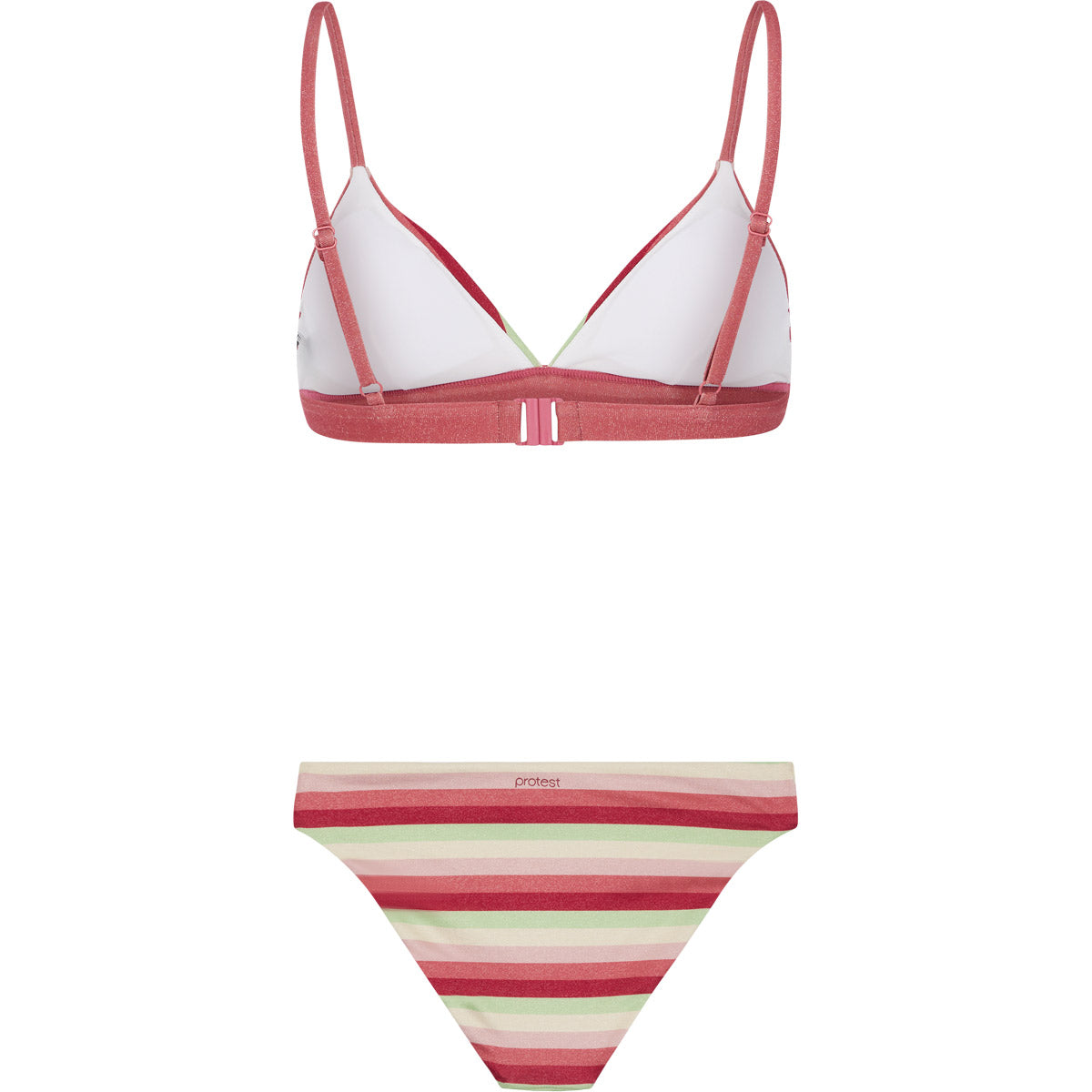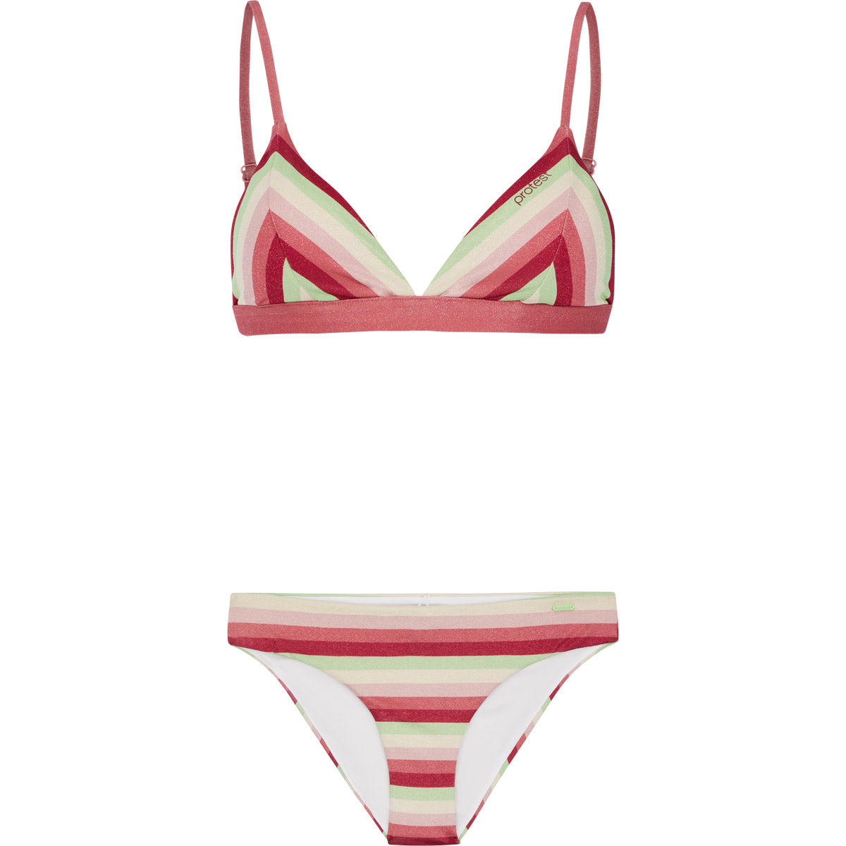 Apuesta por el factor sorpresa este verano con el PRTRAYA de Protest. Este conjunto de bikini incluye un top de bikini triangular y una braguita a juego. El tejido está estampado con un vibrante diseño a rayas; ¡el patrón en V invertida en las copas crea un efecto llamativo! El top tiene copas extraíbles de secado rápido para mayor sujeción y comodidad. Las braguitas tienen un corte regular y cintura. La PRTRAYA también forma parte de nuestro compromiso por hacer las cosas de forma más ecológica; no se utilizan PFC en el proceso de producción.